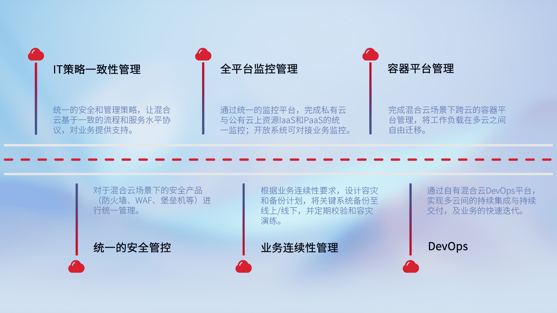 通过多云纳管,,,以统一的资源数据模型把客户的云资源进行抽象和封装,,,进而实现对多云资源的统一操作,,,,保障云资源管理的可靠性、、稳定性与可用性。。。。量身定制化运维内容,,,配置、、、、开发运维、、、补丁管理、、、备份、、监控、、、、认证和访问管理、、、审计和日常巡检等,,,保障在用云过程中的可靠度,,稳定度以及高可用率。。。