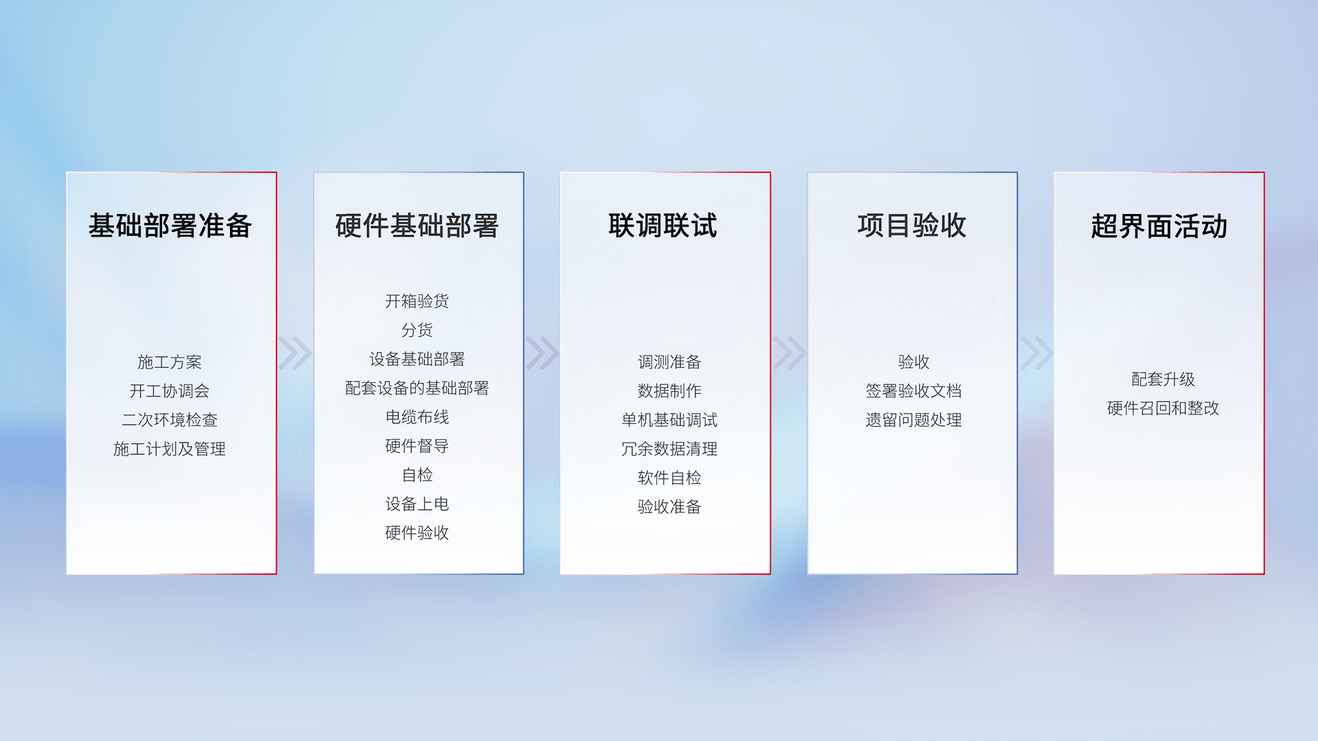 从基础部署准备、、、、硬件基础部署、、联调联试、、、项目验收、、、、越界面活动的全过程可追溯,,,,保证施工质量和进度。。。。